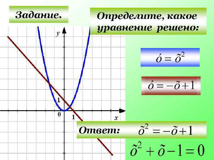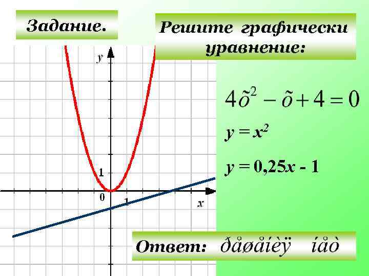 Задание. Решите графически уравнение: у = х2 у = 0, 25 х - 1 Ответ: