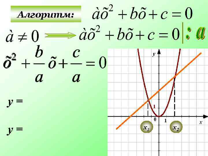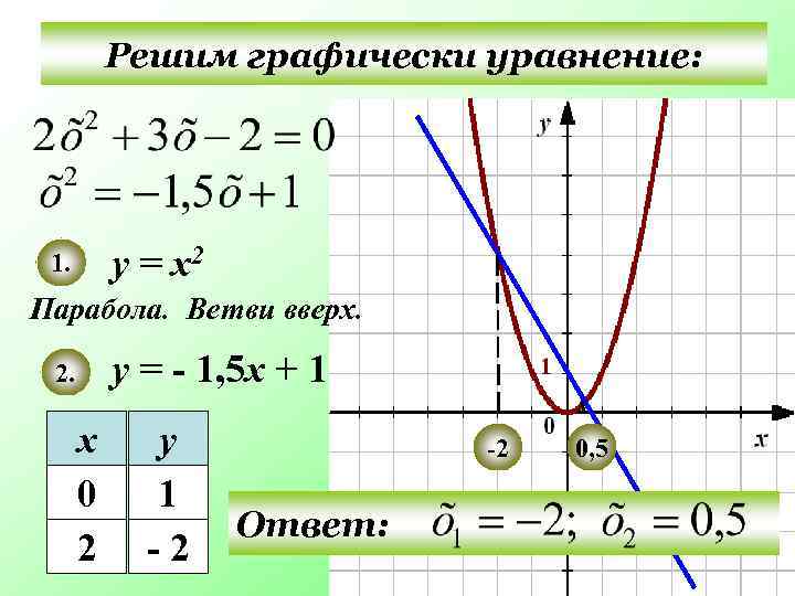 Решим графически уравнение: у = х2 1. Парабола. Ветви вверх. у = - 1, 5 х + 1 2. х 0 2 у 1 -2 -2 Ответ: 0, 5