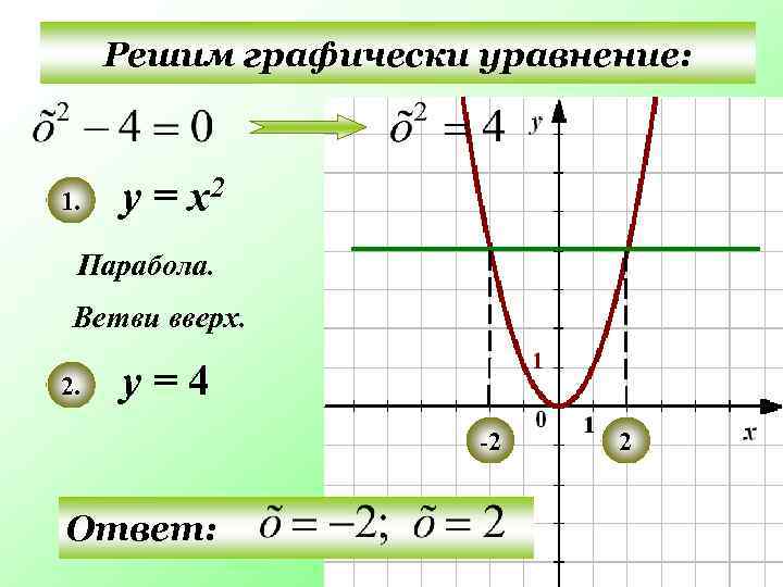 Решим графически уравнение: 1. у = х2 Парабола. Ветви вверх. 2. у=4 -2 Ответ: 2