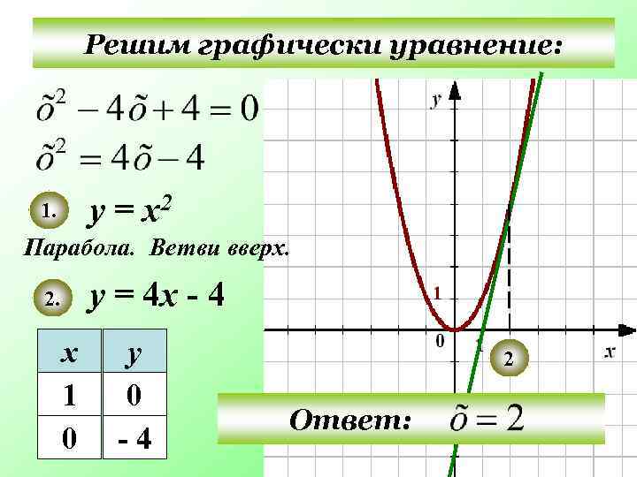 Решим графически уравнение: у = х2 1. Парабола. Ветви вверх. у = 4 х - 4 2. х 1 0 у 0 -4 2 Ответ: