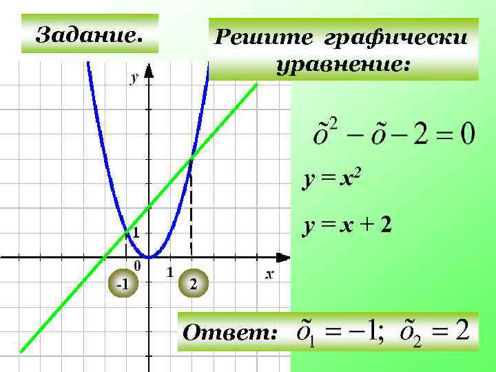 Задание. Решите графически уравнение: у = х2 у=х+2 -1 2 Ответ: