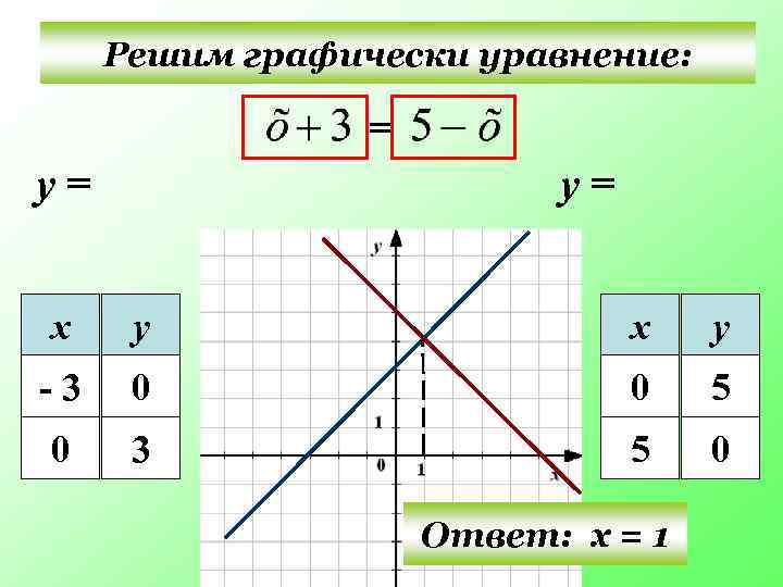 Решим графически уравнение: = у= у= х у -3 0 0 5 0 3 5 0 Ответ: х = 1