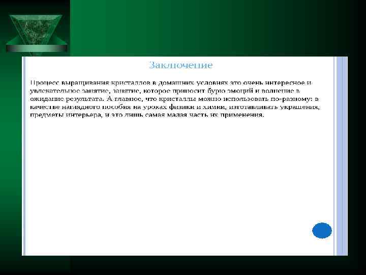 ВЫВОДЫ: Для получения монокристаллов правильной формы необходимо: – наличие затравочного кристалла правильной формы, – постоянное перемешивание раствора, – постоянная поддержка нужной концентрации перенасыщенного раствора, – низкотемпературный режим выращивания кристаллов.