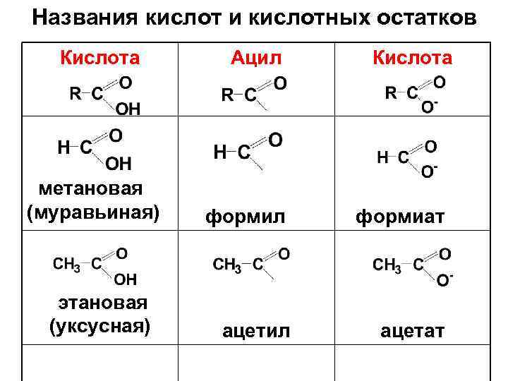 Названия кислот и кислотных остатков Кислота Ацил Кислота метановая (муравьиная) формил формиат этановая (уксусная) ацетил ацетат
