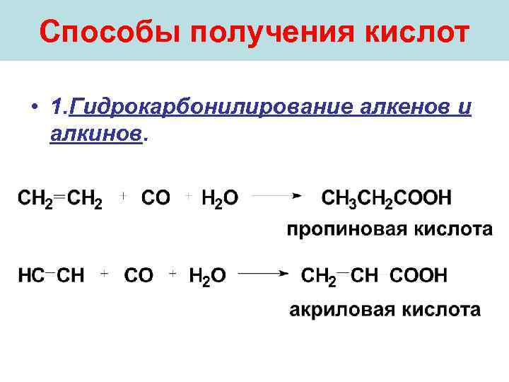 Способы получения кислот • 1. Гидрокарбонилирование алкенов и алкинов.