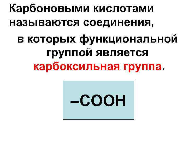 Карбоновыми кислотами называются соединения, в которых функциональной группой является карбоксильная группа. –COOH