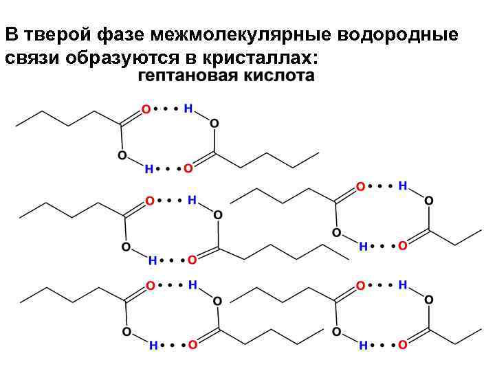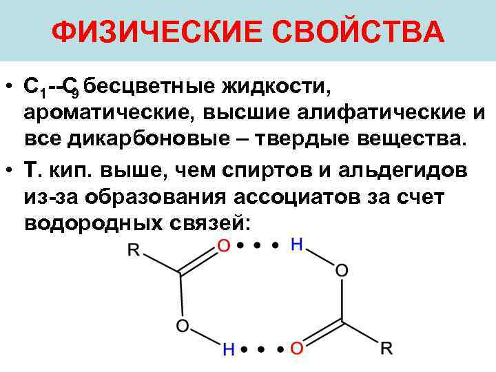 ФИЗИЧЕСКИЕ СВОЙСТВА • С 1 С бесцветные жидкости, 9 ароматические, высшие алифатические и все дикарбоновые – твердые вещества. • Т. кип. выше, чем спиртов и альдегидов из за образования ассоциатов за счет водородных связей: