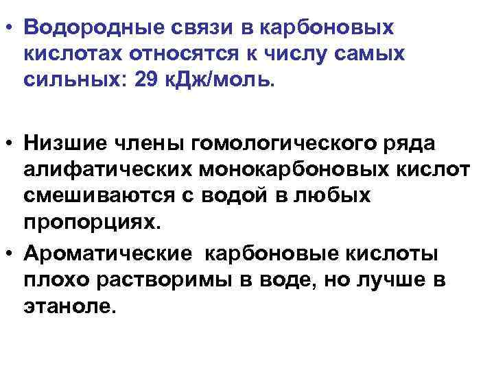 • Водородные связи в карбоновых кислотах относятся к числу самых сильных: 29 к. Дж/моль. • Низшие члены гомологического ряда алифатических монокарбоновых кислот смешиваются с водой в любых пропорциях. • Ароматические карбоновые кислоты плохо растворимы в воде, но лучше в этаноле.