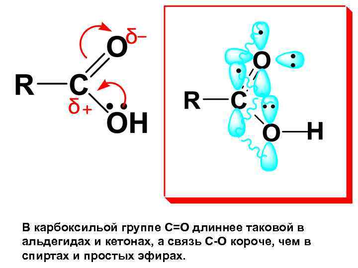 В карбоксильой группе С=О длиннее таковой в альдегидах и кетонах, а связь С О короче, чем в спиртах и простых эфирах.