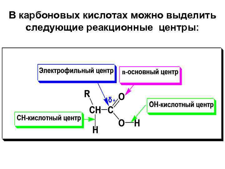 В карбоновых кислотах можно выделить следующие реакционные центры: