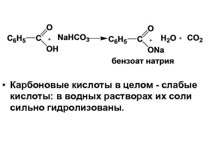 • Карбоновые кислоты в целом слабые кислоты: в водных растворах их соли сильно гидролизованы.