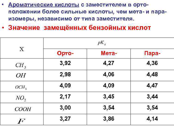 • Ароматические кислоты с заместителем в орто положении более сильные кислоты, чем мета и пара изомеры, независимо от типа заместителя. • Значение замещённых бензойных кислот Х Орто Мета Пара 3, 92 4, 27 4, 36 2, 98 4, 06 4, 48 4, 09 4, 47 2, 17 3, 45 3, 44 3, 00 3, 54 3, 27 3, 86 4, 14