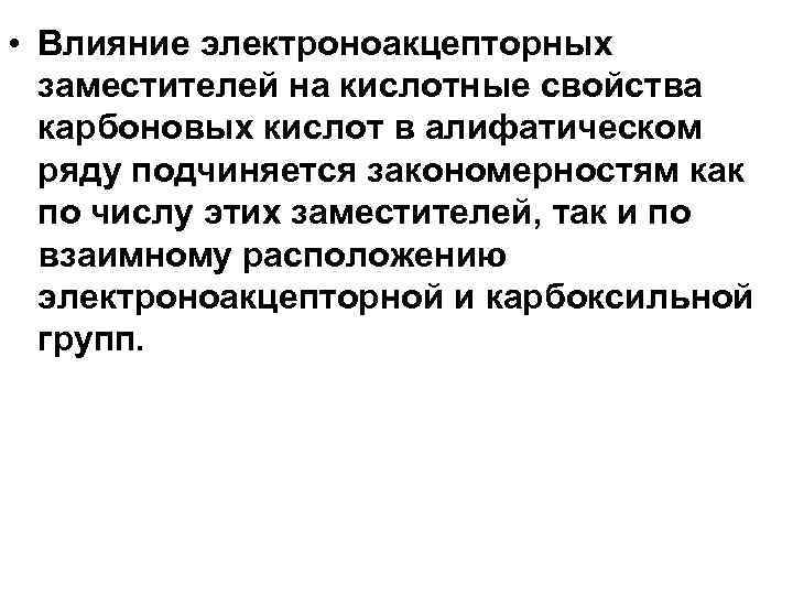 • Влияние электроноакцепторных заместителей на кислотные свойства карбоновых кислот в алифатическом ряду подчиняется закономерностям как по числу этих заместителей, так и по взаимному расположению электроноакцепторной и карбоксильной групп.