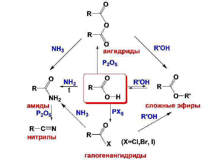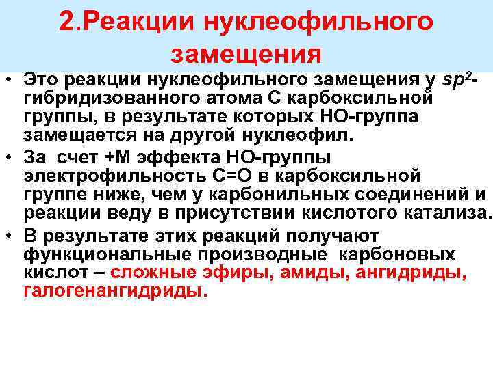 2. Реакции нуклеофильного замещения • Это реакции нуклеофильного замещения у sp 2 - гибридизованного атома С карбоксильной группы, в результате которых НО группа замещается на другой нуклеофил. • За счет +М эффекта НО группы электрофильность С=О в карбоксильной группе ниже, чем у карбонильных соединений и реакции веду в присутствии кислотого катализа. • В результате этих реакций получают функциональные производные карбоновых кислот – сложные эфиры, амиды, ангидриды, галогенангидриды.