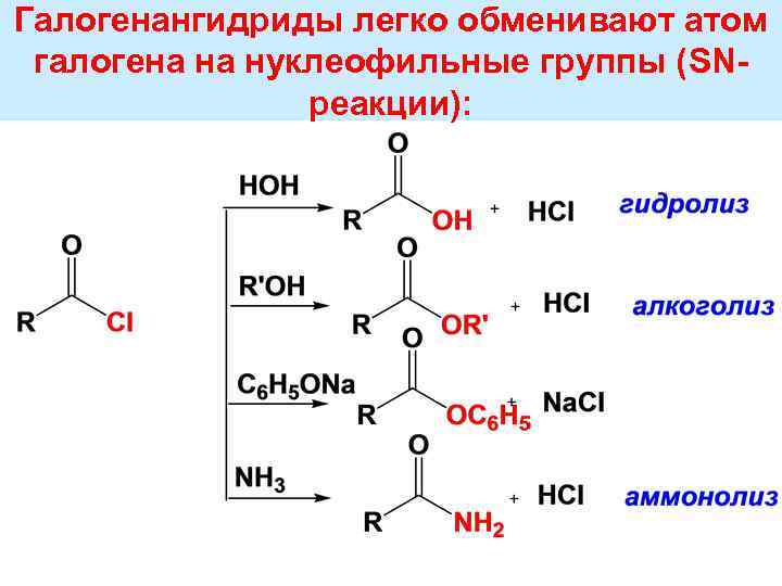 Галогенангидриды легко обменивают атом галогена на нуклеофильные группы (SN реакции):