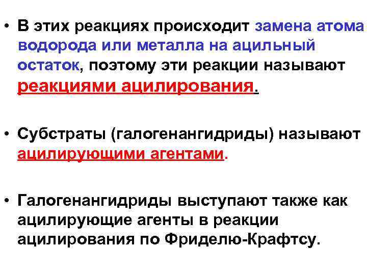 • В этих реакциях происходит замена атома водорода или металла на ацильный остаток, поэтому эти реакции называют реакциями ацилирования. • Субстраты (галогенангидриды) называют ацилирующими агентами. • Галогенангидриды выступают также как ацилирующие агенты в реакции ацилирования по Фриделю Крафтсу.