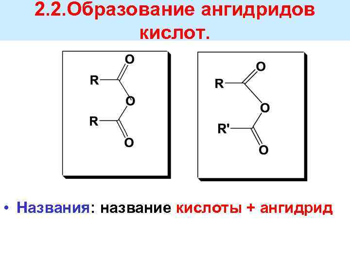 2. 2. Образование ангидридов кислот. • Названия: название кислоты + ангидрид