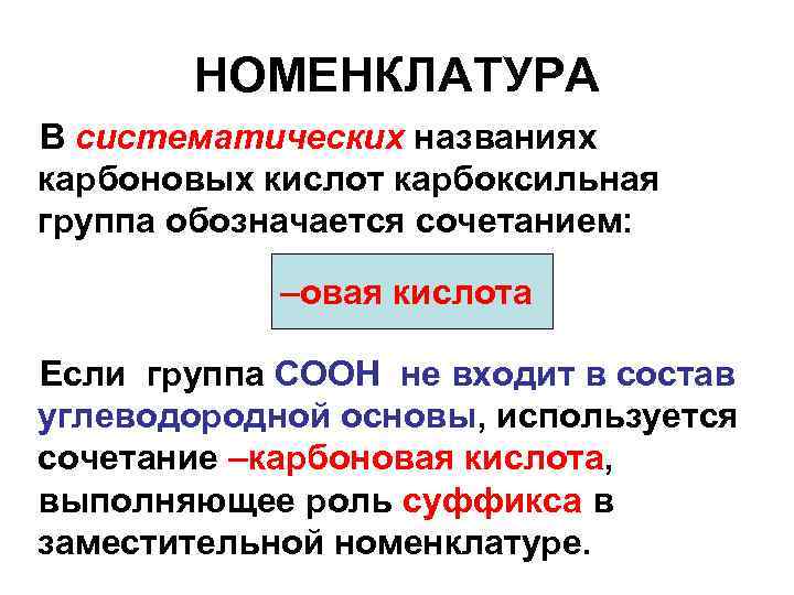 НОМЕНКЛАТУРА В систематических названиях карбоновых кислот карбоксильная группа обозначается сочетанием: –овая кислота Если группа СООН не входит в состав углеводородной основы, используется сочетание –карбоновая кислота, выполняющее роль суффикса в заместительной номенклатуре.