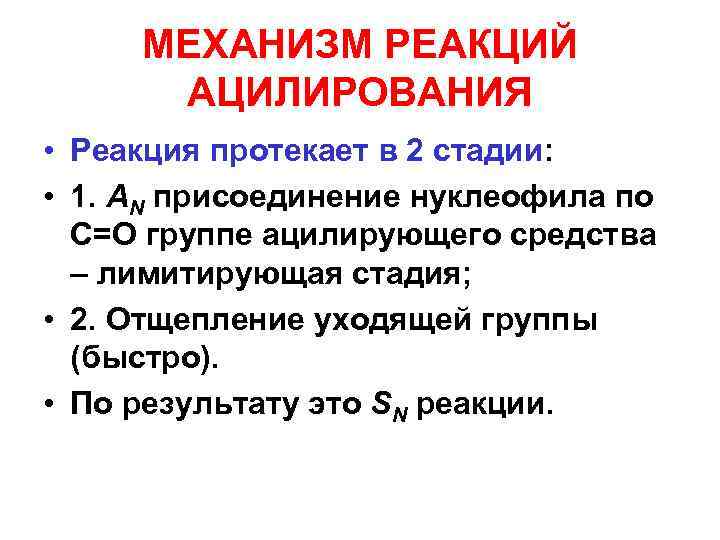 МЕХАНИЗМ РЕАКЦИЙ АЦИЛИРОВАНИЯ • Реакция протекает в 2 стадии: • 1. AN присоединение нуклеофила по С=О группе ацилирующего средства – лимитирующая стадия; • 2. Отщепление уходящей группы (быстро). • По результату это SN реакции.