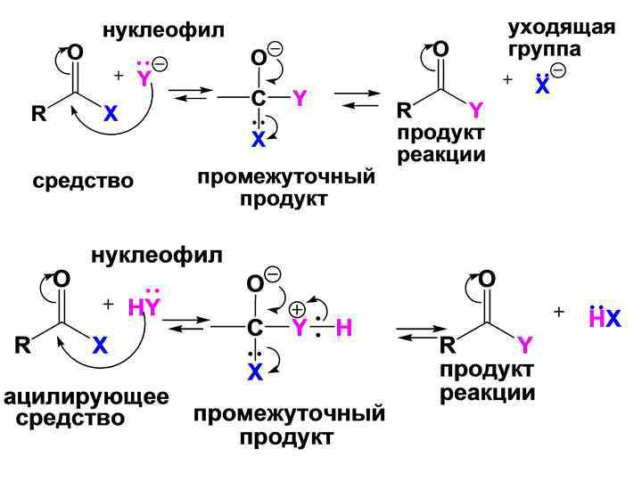 • По своему результату относительно участвующего во взаимодействии нуклеофильного реагента эти реакции могут рассматриваться как реакции – ацилирования введение в молекулу нуклеофильного реагента ацильной группы R CO. Важнейшие ацильне группы: ацетил СН 3 СО , формил НСО , бензоил С 6 Н 5 СО.