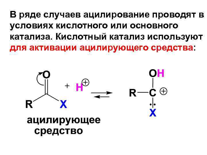 В ряде случаев ацилирование проводят в условиях кислотного или основного катализа. Кислотный катализ используют для активации ацилирующего средства:
