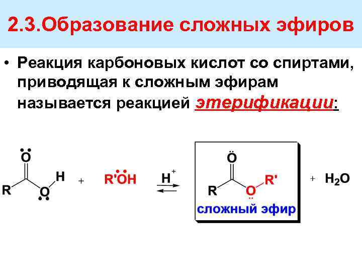 2. 3. Образование сложных эфиров • Реакция карбоновых кислот со спиртами, приводящая к сложным эфирам называется реакцией этерификации:
