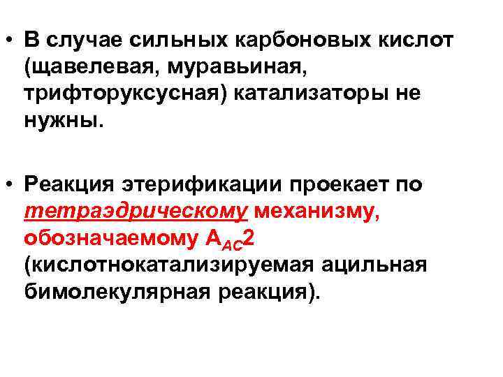 • В случае сильных карбоновых кислот (щавелевая, муравьиная, трифторуксусная) катализаторы не нужны. • Реакция этерификации проекает по тетраэдрическому механизму, обозначаемому ААС 2 (кислотнокатализируемая ацильная бимолекулярная реакция).