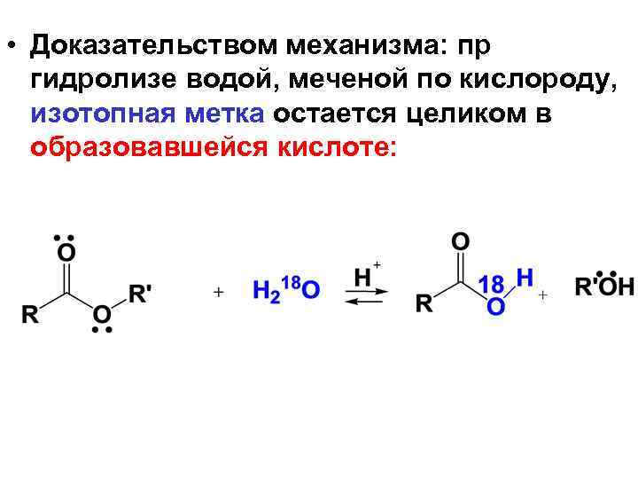 • Доказательством механизма: пр гидролизе водой, меченой по кислороду, изотопная метка остается целиком в образовавшейся кислоте: