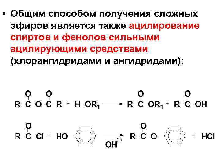 • Oбщим способом получения сложных эфиров является также ацилирование спиртов и фенолов сильными ацилирующими средствами (хлорангидридами и ангидридами):