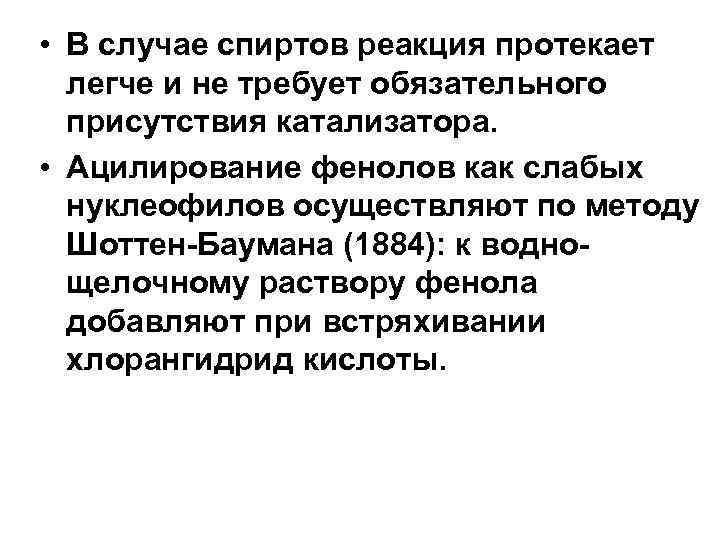 • В случае спиртов реакция протекает легче и не требует обязательного присутствия катализатора. • Ацилирование фенолов как слабых нуклеофилов осуществляют по методу Шоттен Баумана (1884): к водно щелочному раствору фенола добавляют при встряхивании хлорангидрид кислоты.