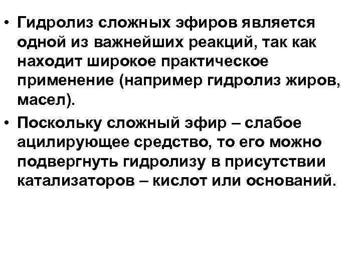 • Гидролиз сложных эфиров является одной из важнейших реакций, так как находит широкое практическое применение (например гидролиз жиров, масел). • Поскольку сложный эфир – слабое ацилирующее средство, то его можно подвергнуть гидролизу в присутствии катализаторов – кислот или оснований.