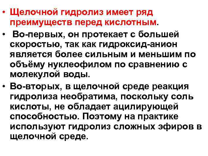 • Щелочной гидролиз имеет ряд преимуществ перед кислотным. • Во первых, он протекает с большей скоростью, так как гидроксид анион является более сильным и меньшим по объёму нуклеофилом по сравнению с молекулой воды. • Во вторых, в щелочной среде реакция гидролиза необратима, поскольку соль кислоты, не обладает ацилирующей способностью. Поэтому на практике используют гидролиз сложных эфиров в щелочной среде.