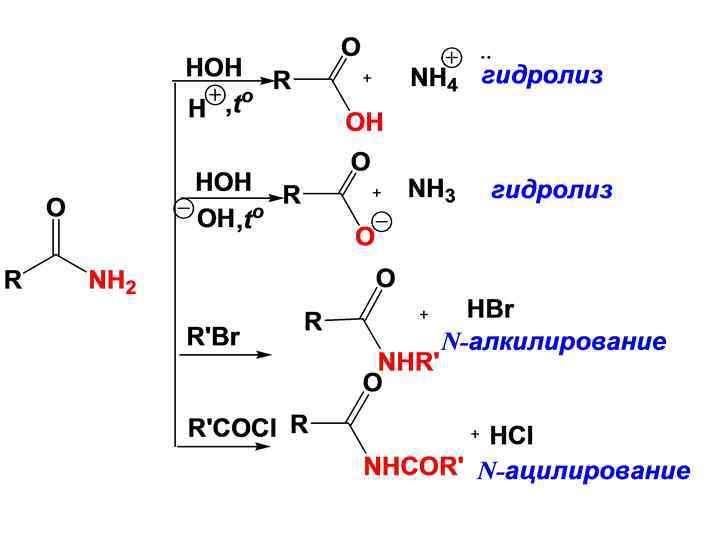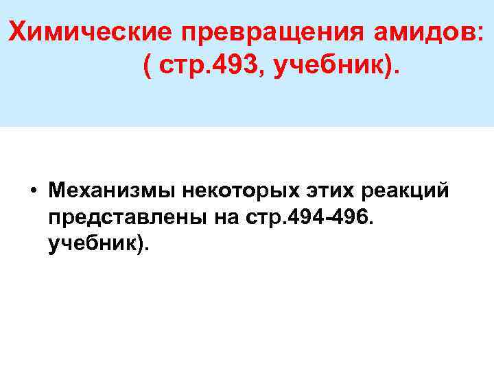 Химические превращения амидов: ( стр. 493, учебник). • Механизмы некоторых этих реакций представлены на стр. 494 496. учебник).