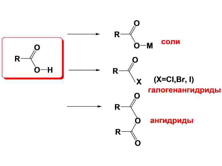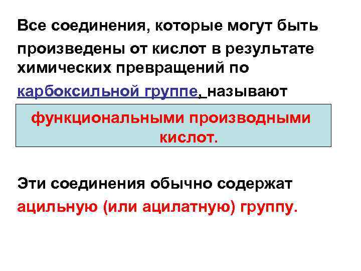 Все соединения, которые могут быть произведены от кислот в результате химических превращений по карбоксильной группе, называют функциональными производными кислот. Эти соединения обычно содержат ацильную (или ацилатную) группу.