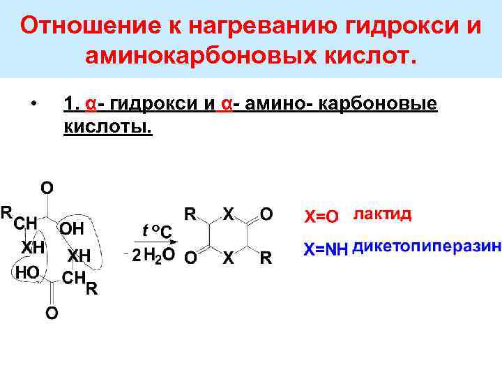 Отношение к нагреванию гидрокси и аминокарбоновых кислот. • 1. α гидрокси и α амино карбоновые кислоты.