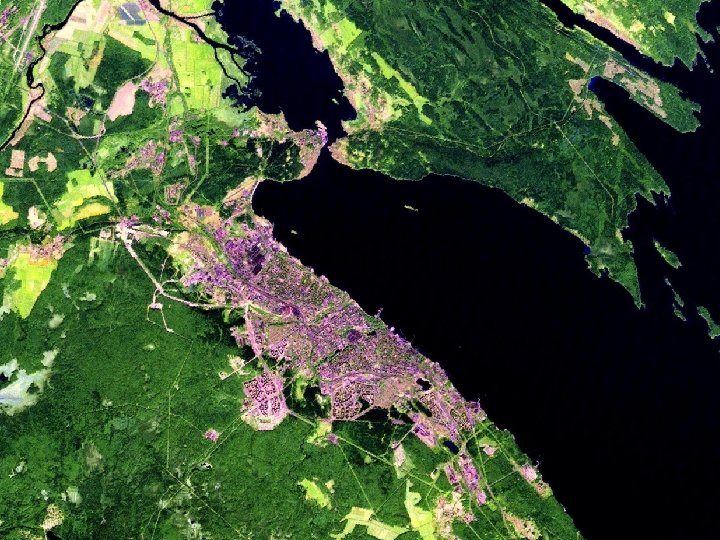 «Пояс» хвойных лесов вокруг г. Петрозаводска Далее на космическом снимке отчетливо видна узкая темно-зеленая полоса коренных хвойных лесов, существовавших до недавнего времени вокруг застроенных территорий и жилых районов г. Петрозаводска. Далее видны более светлые обширные территории занятые вторичными лиственными лесами.
