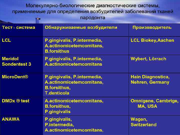 Основные пародонтопатогены из группы бесспоровых анаэробов: • Aggregatibacter (Actinobacillus) actinomycetemcomitans, серотипы а, b • Tannerella forsithia (Bacteroides forsithus) • Porphyromonas gingivalis • Prevotella intermedia • Treponema denticola