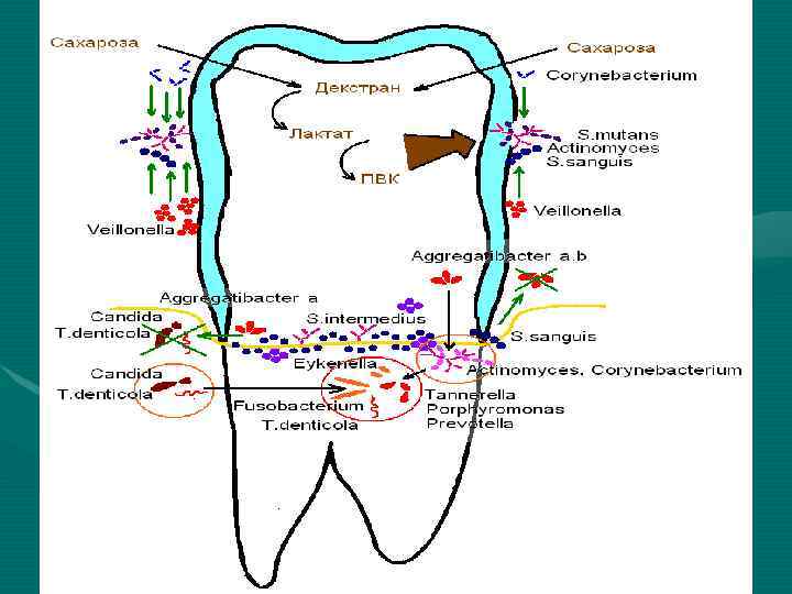 КАРИЕСОГЕННЫЕ ВИДЫ: 1. Streptococcus mutans, Streptococcus sanguis 2. Actinomyces odontolyticus, Actinomyces spp. 3. Lactobacillus spp. ВИДЫ-АНТАГОНИСТЫ: 1. Veillonella alcalescence 2. Veillonella parvula 3. Neisseria spp. ГЛИКАНЫ – резервные полисахариды биоплёнки, которые используются кариесогенными бактериями в ночное время
