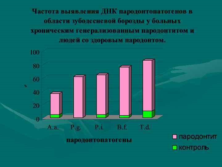 Вид анаэробных бактерий и вирусов Генотип человека Отношение частот р Положитель ный (n = 44) Отрицательный (n = 51) P. intermedia 29 (65, 6) 15 (29, 4) 2, 2 0, 0004 * B. forsythus 28 (63, 6) 20 (39, 2) 1, 6 0, 014* T. denticola 24 (54, 5) 14 (27, 5) 2, 0 0, 004* A. actinomycetemcomitans 17 (38, 6) 16 (31, 4) 1, 2 0, 341 P. gingivalis 33 (75, 0) 14 (27, 0) 2, 8 0, 0001* пять видов 7 (15, 9) 3 (5, 9) 2. 7 - нет микробов 3 (6, 8) 2 (3, 9) 1, 7 - HSV 1 типа 13 (29, 5) 4 (7, 8) 3, 8 0, 007* HSV 2 типа 3 (7, 3) 1 (2, 0) 3, 7 - CMV 6 (13, 6) 2 (3, 9) 3, 5 0, 089 EBV 12 (27, 2) 2 (3, 9) 6, 9 0, 0025*