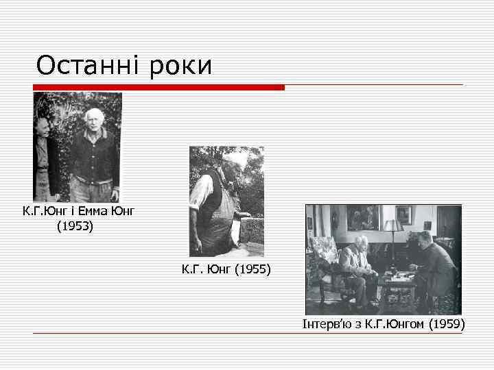 Останні роки К. Г. Юнг і Емма Юнг (1953) К. Г. Юнг (1955) Інтерв’ю з К. Г. Юнгом (1959)