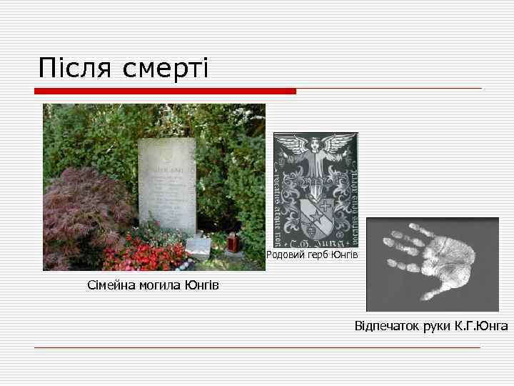 Після смерті Родовий герб Юнгів Сімейна могила Юнгів Відпечаток руки К. Г. Юнга