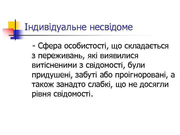 Індивідуальне несвідоме - Сфера особистості, що складається з переживань, які виявилися витісненими з свідомості, були придушені, забуті або проігноровані, а також занадто слабкі, що не досягли рівня свідомості.