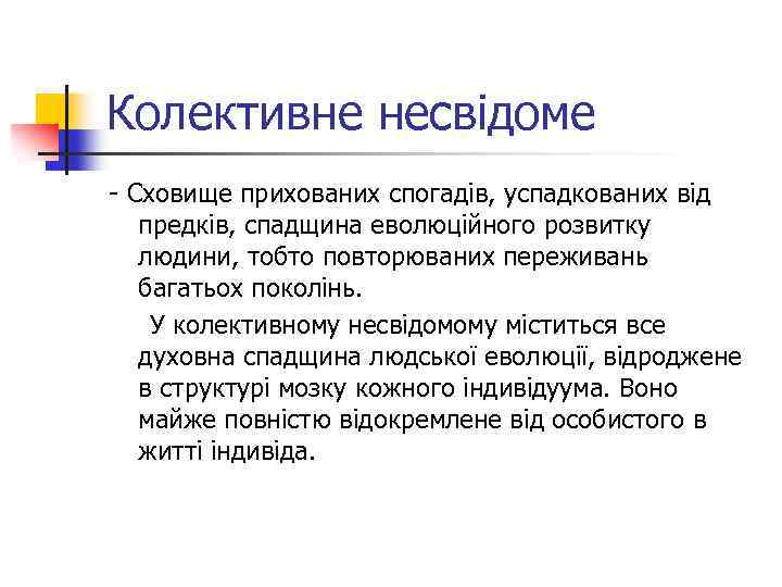 Колективне несвідоме - Сховище прихованих спогадів, успадкованих від предків, спадщина еволюційного розвитку людини, тобто повторюваних переживань багатьох поколінь. У колективному несвідомому міститься все духовна спадщина людської еволюції, відроджене в структурі мозку кожного індивідуума. Воно майже повністю відокремлене від особистого в житті індивіда.