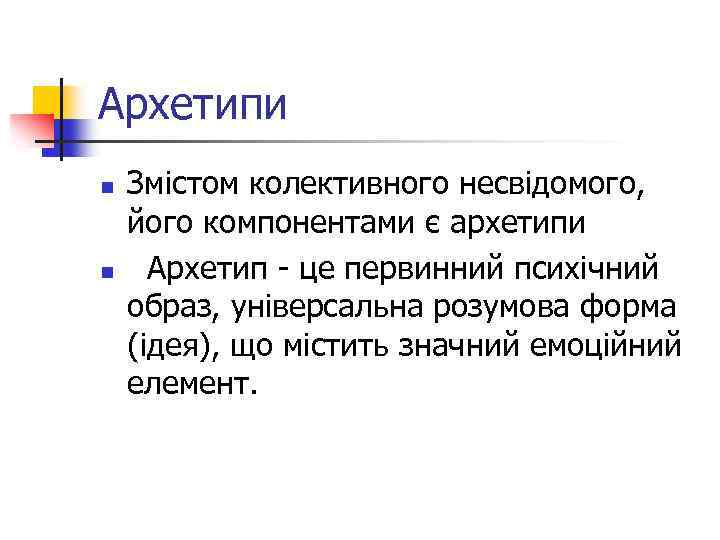 Архетипи n n Змістом колективного несвідомого, його компонентами є архетипи Архетип - це первинний психічний образ, універсальна розумова форма (ідея), що містить значний емоційний елемент.