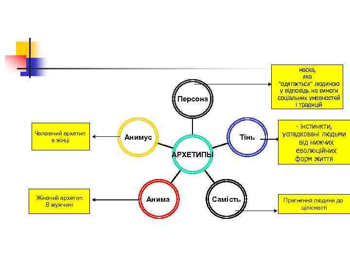 маска, яка "одягається" людиною у відповідь на вимоги соціальних умовностей і традицій Персона Чоловічий архетип в жінці Анимус Тінь АРХЕТИПЫ Жіночий архетип В мужчині Анима Самість - інстинкти, успадковані людьми від нижчих еволюційних форм життя Прагнення людини до цілісності