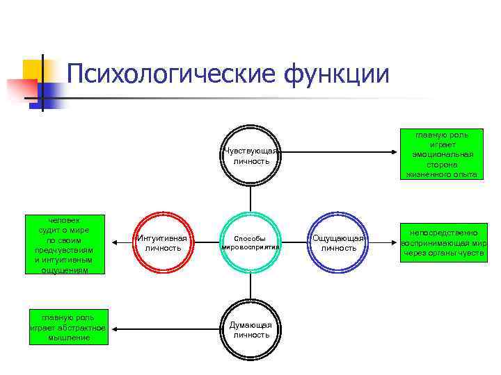 Психологические функции главную роль играет эмоциональная сторона жизненного опыта Чувствующая личность человек судит о мире по своим предчувствиям и интуитивным ощущениям главную роль играет абстрактное мышление Интуитивная личность Способы мировосприятия Думающая личность Ощущающая личность непосредственно воспринимающая мир через органы чувств