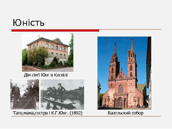 Юність Дім сім’ї Юнг в Кесвілі Тато, мама, сестра і К. Г. Юнг. (1892) Базельский собор