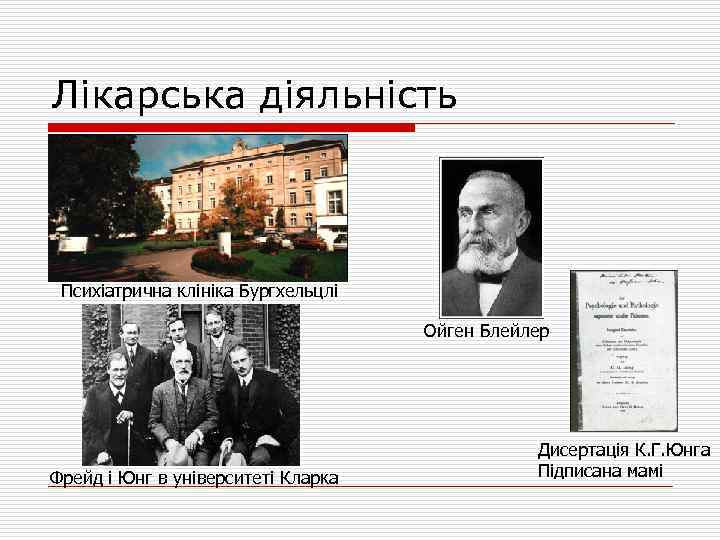 Лікарська діяльність Психіатрична клініка Бургхельцлі Ойген Блейлер Фрейд і Юнг в університеті Кларка Дисертація К. Г. Юнга Підписана мамі