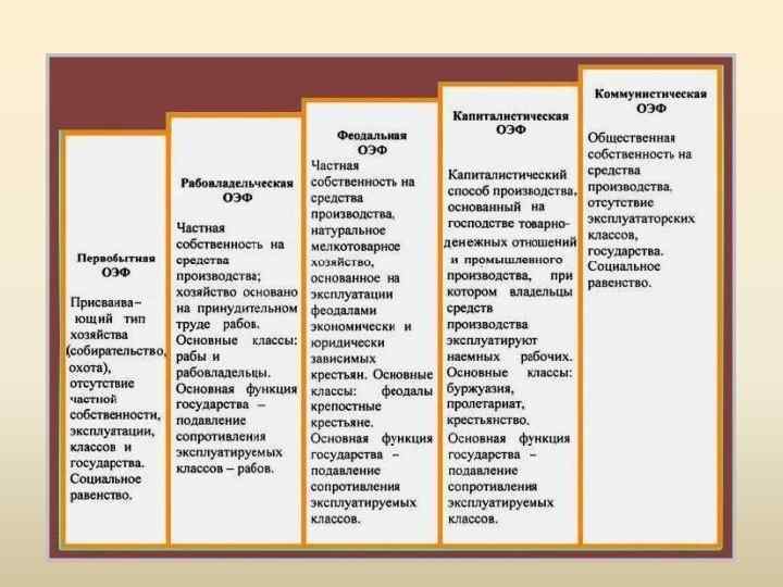 Переход человечества от одной ОЭФ к другой есть естественноисторический процесс, т. е. не зависящий от сознания и воли людей и определяющий их сознание и волю. В более простой схеме вышеназванные способы производства можно уложить в три основные эпохи человеческой истории (не экономической формации): 1) доклассовая (первобытнообщинная, доиндустриальная, неэкономическая); 2) классовая (рабовладельческое, феодальное, капиталистическое общества - экономические); 3) бесклассовая (неэкономическое, коммунистическое общество, первой фазой которого является социализм). Маркс и Энгельс доказывали, что коммунизм — более высокий тип экономической формации, а переход от капитализма к коммунизму — важнейшая закономерность, реализующаяся в результате пролетарскосоциалистической революции. Эта революция произойдет в силу того, что капиталистическое общество не сможет разрешить присущие ему противоречия эволюционным путем. Они полагали, что капиталистическая формация, в рамках которой они жили, достигла предела своих возможностей и пролетарскосоциалистическая революция скоро наступит. То, что они заблуждались, Энгельс был вынужден признать в конце своей жизни.