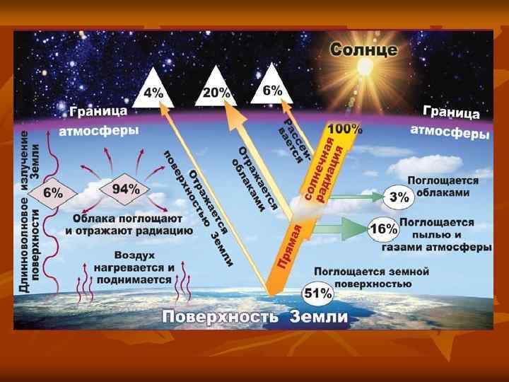 Зависит от: - Прозрачности атмосферы, - Альбедо земли Коэффициент прозрачности атмосферы: - величина, характеризующая меру прозрачности атмосферы для солнечной радиации Определяется отношением интенсивностей поверхности Земли и на границе атмосферы Облачность: - перистые облака пропускают от 60 до 80%, - перисто-слоистые — от 45 до 70%, - высоко-кучевые — от 10 до 25%. радиации у